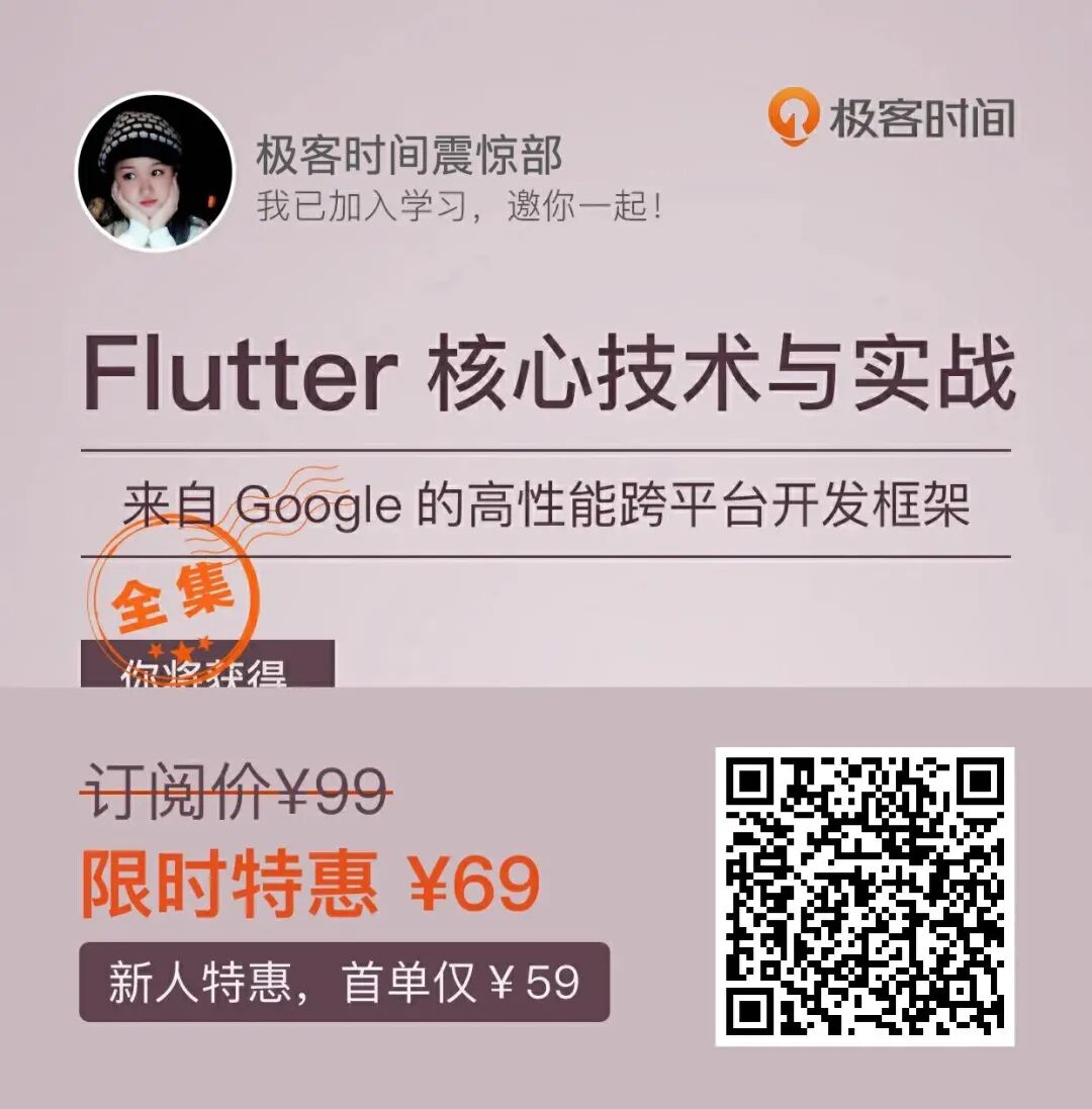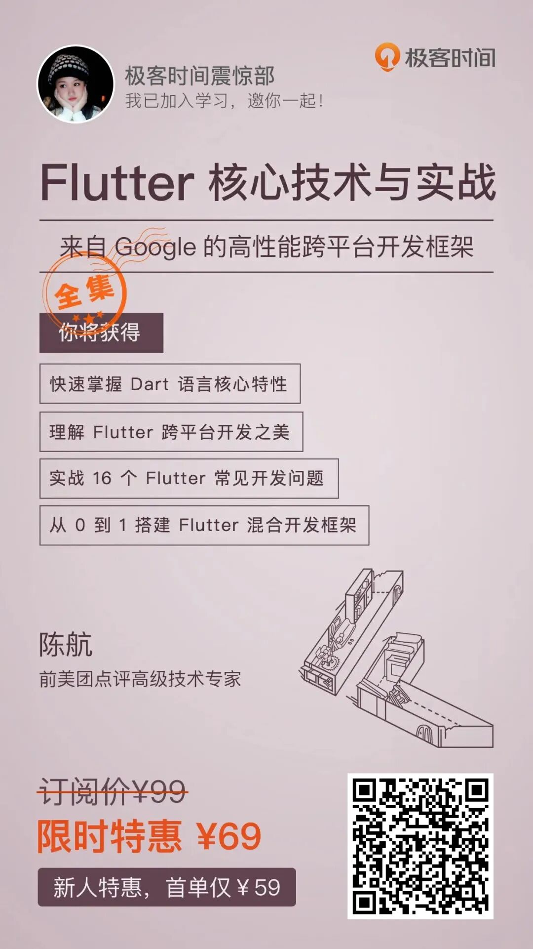 图谱的作者在他的极客时间专栏《Flutter 核心技术与实战》专栏里,重点讲述了 Flutter 框架底层有哪些关键技术?Flutter 应用开发的最佳实践是怎样的?企业需要什么样的终端技术人才?等问题。