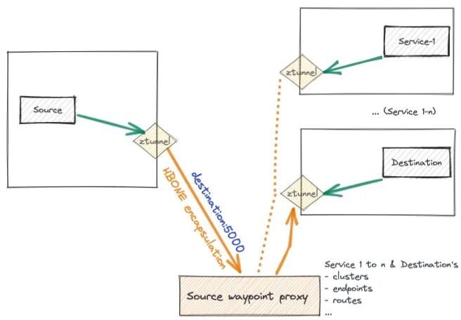 通过只关注目的服务的 waypoint 代理,waypoint 代理配置仅需包含非常有限的动态集群、端点和路由相关的详细信息即可,其中 waypoint 代理需要连接到这些动态集群、端点和路由,而无需将所有潜在连接到其运行的 Kubernetes 集群中的任何服务的详细信息都包含内。这一更改有效地消除了对 waypoint 代理支持 Sidecar 资源的需求,也避免了用户手动配置 Sidecar 资源。