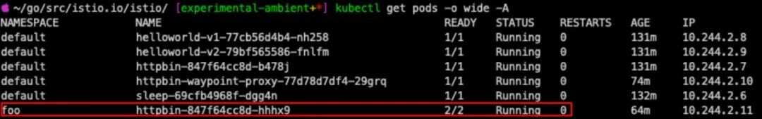 例如,在我的 Kubernetes 集群中,我将 sleep、helloworld 和 httpbin 应用程序以无 Sidecar 的形式部署在了 default 命名空间中。我还将 httpbin 应用程序与 Sidecar 一起部署在 foo 命名空间中。