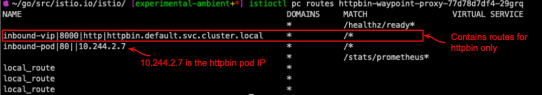 相比之下,以下是 httpbin 大大减少了 waypoint 代理的路由配置。请注意,在 foo 命名空间中没有与 helloworld 或 sleep 应用程序或 httpbin 应用程序相关的路由。虽然这里使用动态路由作为示例,但与 Sidecar 相比,动态集群和端点也减少了仅限于目的的 waypoint 代理。