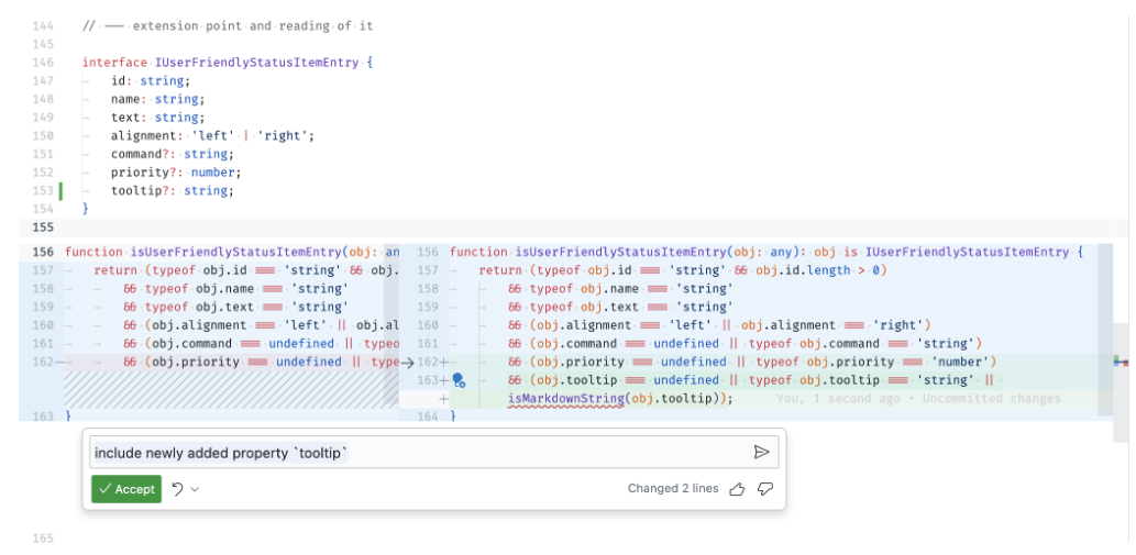 isUserFriendlyStatusItemEntrycheck。 - Reply 在编辑器中使用嵌入式差异视图显示。它的右侧可以通过 VS Code 的语言扩展进行编辑和检查。