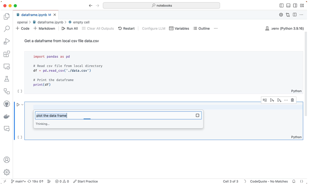 改进了 notebook 编辑器中的聊天体验。在 notebook 文档中使用 Copilot 时,Copilot 可以使用 notebook 上下文提供更多相关建议。例如,代码建议使用先前单元格中定义的变量或模块,而无需重新创建或重新导入它们。- Microsoft Build 2023 上的 VS Code