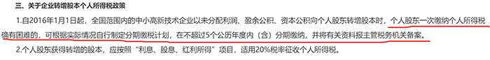 自2016年1月1日起,全国范围内的中小高新技术企业以未分配利润、盈余公积、资本公积向个人股东转增股本时,个人股东一次缴纳个人所得税确有困难的,可根据实际情况自行制定分期缴税计划,在不超过5个公历年度内(含)分期缴纳,并将有关资料报主管税务机关备案。