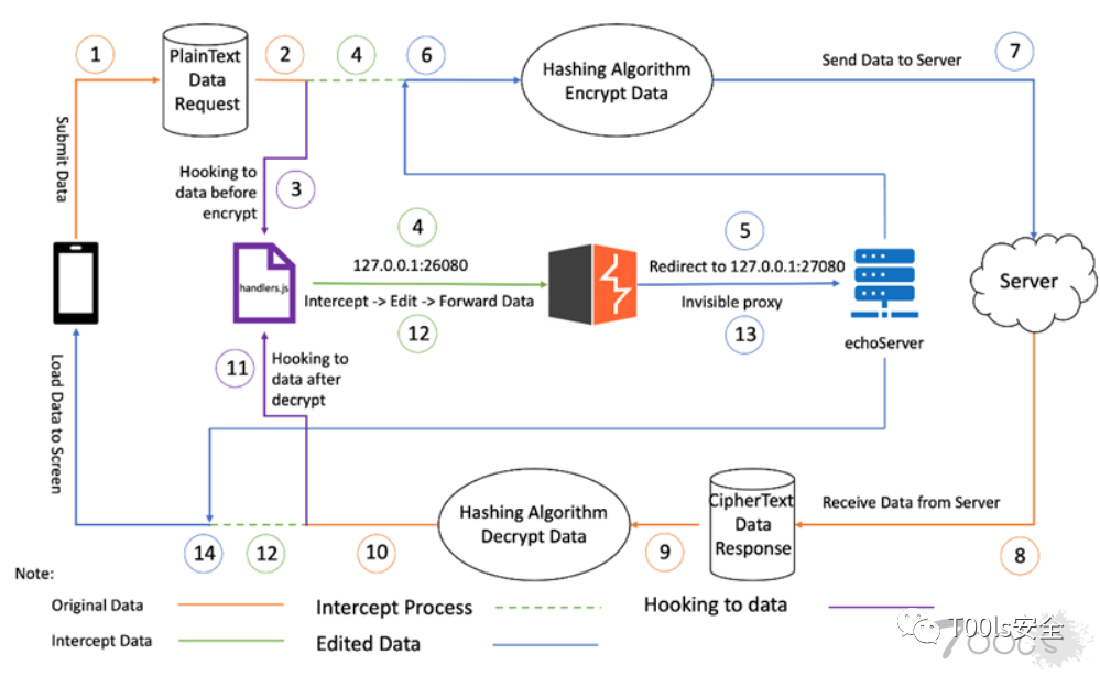 Java.perform(function () { var CryptoUtil = Java.use('com.xxxx.security.CryptoUtil'); CryptoUtil.encryptDataWithSM.implementation = function(app,dataStr,keyStr) { console.log("Hook Start..."); console.log("encrycptDataStr",dataStr,keyStr); var data; send({from:"/http",payload:dataStr,api_path:"request"}); //将dataStr发送到burpTracer.py <!-- 接收burp篡改后返回的数据 ↓--> var op = recv("input",function(value){ data = value.payload }); op.wait(); console.log("经过burp修改后的参数:" +data); var ret = this.encryptDataWithSM(app,data,keyStr); return ret; }//hook解密函数 CryptoUtil.decryptDataWithSM.implementation = function (app,dataStr,keyStr) { var getVal = this.decryptDataWithSM(app, dataStr, keyStr); send({ from: "/http", payload: getVal, api_path: "response" }); var op = recv('input',function (value) { console.log(value.payload); }); op.wait(); return getVal;} });from codecs import ignore_errorsimport fridaimport requestsimport timeimport sysimport osimport socketimport argparsefrom log import *print ('''\033[1;31m \n _____ _ _ ___ _ ____ _| ___| __(_) __| | __ _ |_ _|_ __ | |_ ___ _ __ / ___|___ _ __ | |_| |_ | '__| |/ _` |/ _` | | || '_ \| __/ _ \ '__| | / _ \ '_ \| __|| _|| | | | (_| | (_| | | || | | | || __/ | | |__| __/ |_) | |_|_| |_| |_|\__,_|\__,_| |___|_| |_|\__\___|_| \____\___| .__/ \__| #pyth0n |_| Intercept Api in Android Application''')print ("\033[1;34m<li>___author___: @Pyth0n\033[1;37m")print ("\033[1;34m<li>___version___: 1.0\033[1;37m")print ("")BURP_HOST = "127.0.0.1"BURP_PORT = 26080def check_platform(): try: platforms = { 'linux' : 'Linux', 'linux1' : 'Linux', 'linux2' : 'Linux', 'darwin' : 'OS X', 'win32' : 'Windows' } if sys.platform not in platforms: sys.exit(logger.error("[x_x] Your platform currently does not support.")) except Exception as e: logger.error("[x_x] Something went wrong, please check your error message.\n Message - {0}".format(e))def check_ps_for_win32(): try: if sys.platform == "win32": PROCESSNAME = "iTunes.exe" for proc in psutil.process_iter(): try: if proc.name() == PROCESSNAME: return True except (psutil.NoSuchProcess, psutil.AccessDenied, psutil.ZombieProcess) as e: pass return sys.exit(logger.error("[x_x] Please install iTunes on MicrosoftStore or run iTunes frist.")) except Exception as e: logger.error("[x_x] Something went wrong, please check your error message.\n Message - {0}".format(e))def check_echo_server(): sock = socket.socket(socket.AF_INET, socket.SOCK_STREAM) result = sock.connect_ex(('127.0.0.1',27080)) if result == 0: logger.info("<li> Connect to echoServer successfully.") else: sock.close() sys.exit(logger.error("[x_x] Please start echoServer."))def run(): #check platform support check_platform() #check process iTunes for Win32s #check_ps_for_win32() #check python version if sys.version_info < (3, 0): logger.error("[x_x] iOS hook requires Python 3.x") sys.exit(0) else: handle_del_log() main()def handle_del_log(): try: pwd = os.getcwd() path = pwd + '/errors.log' file_stats = os.stat(path) if (file_stats.st_size > 1024000000): #delete errors.log if file size > 1024 MB os.remove(path) else: return True except Exception as e: logger.error("[x_x] Something went wrong when clear error log. Please clear error log manual.\n [Error Message] - {0}".format(e))def main(): def frida_process_message(message, data): handled = False if message['type'] == 'input': handled = True elif message['type'] == 'send': body = message['payload'] API_PATH = body['api_path'] if body['from'] == '/http': try: # 把数据发给 本地burp 监听的 26080端口 req = requests.request('FRIDA', 'http://%s:%d/%s' % (BURP_HOST, BURP_PORT, API_PATH), headers={'content-type':'application/json'}, data=body['payload'].encode('utf-8')) script.post({ 'type': 'input', 'payload': req.text }) # 把修改后的数据传输回给js handled = True except requests.exceptions.RequestException as e: logger.error("[x_x] Connection refused, please check configurage on BurpSute.\n [Error Message] - {0}".format(e)) parser = argparse.ArgumentParser() parser.add_argument("-p", "--package") parser.add_argument("-n", "--name") parser.add_argument("-s", "--script", help='custom handler script') parser.add_argument("-r", "--remote",help="远程主机") args, leftovers = parser.parse_known_args() try: #Spawning application with default script if args.package is not None and args.script is None: #check echoServer check_echo_server() # logger.info('<li> Spawning: ' + args.package) logger.info('<li> Script: ' + 'handlers.js') time.sleep(2) device = frida.get_usb_device() pid = device.spawn(args.package) device.resume(pid) time.sleep(1) session = device.attach(pid) with open("handlers.js") as f: script = session.create_script(f.read()) script.on("message", frida_process_message) script.load() input() #Attaching default script to application if args.name is not None and args.script is None: #check echoServer check_echo_server() # logger.info('<li> Attaching: ' + args.name) logger.info('<li> Script: ' + 'handlers.js') time.sleep(2) process = frida.get_usb_device().attach(args.name) with open("handlers.js") as f: script = process.create_script(f.read()) script.on("message", frida_process_message) script.load() input() # Spawing application with custom script if args.package is not None and args.script is not None: #check echoServer check_echo_server() # if os.path.isfile(args.script): logger.info('<li> Spawning: ' + args.package) logger.info('<li> Script: ' + args.script) time.sleep(2) device = frida.get_remote_device() pid = device.spawn(args.package) device.resume(pid) time.sleep(1) session = device.attach(pid) with open(args.script,encoding='utf-8',errors='ignore') as f: script = session.create_script(f.read()) script.on("message", frida_process_message) script.load() input() else: logger.error('[?] Script not found!') #Attaching default script to application if args.name is not None and args.script is not None: #check echoServer check_echo_server() # logger.info