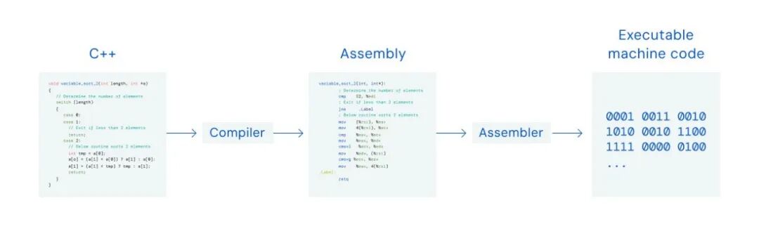 现在,虽然开发者多用 C++ 等高级编程语言写代码,但为了让计算机理解,还是必须用编译器将其转换为“低级”汇编指令,再由汇编程序将汇编指令转换为计算机可以运行的可执行机器代码。