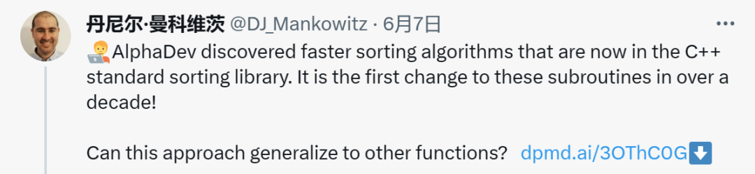 为了让更多人用到这个新排序算法,DeepMind 对算法进行了逆向工程,并以此改进了 LLVM libc++ 标准排序库,可供全球数百万开发者和公司使用。DeepMind 计算机科学家 Daniel Mankowitz 激动表示:“这些算法目前位于 C++ 标准排序库中,这是十多年来对这些子例程的首次更改!”