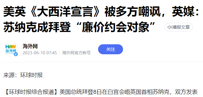 要是普通人,说不定会被蒙过去,但奈杰尔·亚当斯和纳丁·多里斯,可都是当过大臣的人啊,这种事怎么操作,他们会不知道?看到这里,不少小伙伴应该又能看出这事背后的怪异之处了:这两人知道这份名单,也有好几天了,为啥要选在约翰逊宣布辞去国会议员身份后,他们才突然发飙呢?原因我昨天已经说过了:在约翰逊宣布辞职的前一天,发生了另一件事!苏纳克跑去了美国,和拜登会面,还签署了一份文件,叫《大西洋宣言》!苏纳克去美国之前,他的一帮人,拼命跟媒体讲:我们这次去美国,是准备和美国人好好谈谈,大家一起,搞个自由贸易协定!