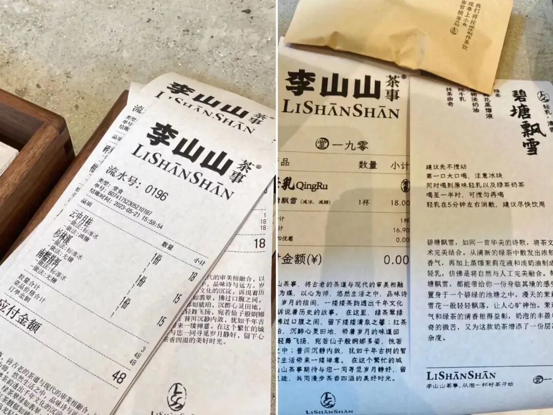 顾客在“李山山茶事”点单后,产品的使用原料、饮用方法及背景故事也会随小票一同打印出来,为了让大家掌握奶茶的正确打开方式,他们甚至还准备了“喝奶茶教学视频”。
