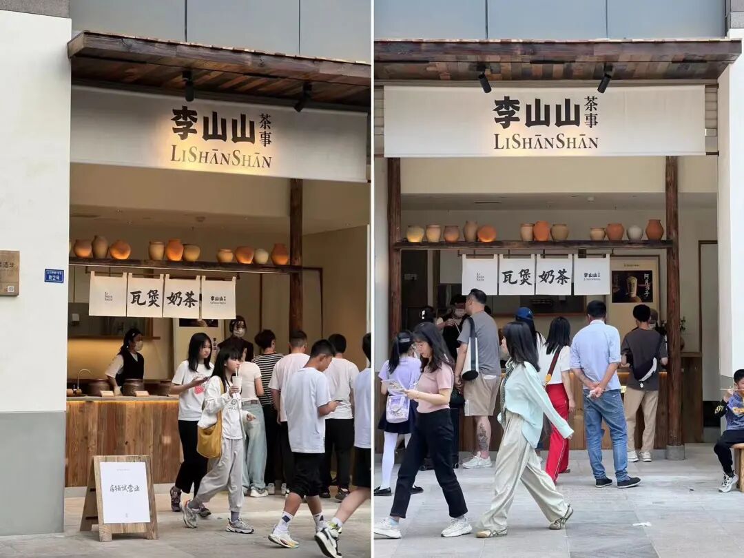 目前,“李山山茶事”不支持线上小程序点单,顾客只能到店下单。在出品时,他们目前也不似常规奶茶店主动提供杯盖吸管,还明确表示现制茶饮无法打包,不支持跑腿外卖,高峰期每客订单限购 2 杯。如此“任性”的卖奶茶方式,依然吸引了大批消费者买单。创始人李屾告诉我,5 月 26 日正式开业至今,门店平均每天卖出 800~1000 杯,已达到目前门店可承载的极限。李屾自毕业后一直从事茶饮行业。他观察到,近两年消费者经过加料、猎奇等“口感大爆炸”阶段后,口味渐渐回归到茶本身,越来越喜欢茶感重的产品,身边朋友也开始主动购买茶叶饮用,所以门店重点围绕“茶”做表达。为了突出茶感,他在饮品出品上摸索出一套独特的思路:在制作茶底时,特意选择瓦煲,是因为相比金属器皿,瓦煲在控制温度上具有优势。瓦煲一类容器,加热慢、散热也慢,用来煮茶,受火更均匀,也能更大程度激发出茶的韵味。在产品出杯时,刻意不将茶、奶做搅拌融合,而是保持一定程度的分离。李屾介绍,“茶奶完全融合是在入口后实现的,这样可以更多保留茶本身的味道,消费者在饮用时茶感更明确。”在售卖环节,只做线下生意,不支持打包外带,甚至不主动配杯盖吸管,为的是完整呈现出一杯饮品的视觉、嗅觉、味觉 3 个维度,还原传统茶体验。“用户如果盖上杯盖打包带走用吸管喝,那只能感受到饮品尾段的茶感,对饮品中茶的感知依然是模糊的。”李屾说。凭借差异化的出品模式、鲜明的门店标签,李山山茶事自开业以来,无论在消费端还是行业端,都有极高的讨论度,大家对其评价也趋向两极分化。有人说,李山山茶事有别于千篇一律的奶茶店,新颖的产品思路、产品表达,是一次大胆的、有创意的尝试。将消费者汇集到线下,与顾客面对面交流,不仅能够有效拉近门店与用户之间的距离,也督促门店更加关注提升产品与服务。但也有人认为,这家店坚持不了多久就会改为传统出杯流程,不然效率提上不去。一味坚持特色出杯体验,网红光环一旦退去,门店或将面临倒闭风险。伴随门店热度持续走高,线下排队时间越来越长,部分消费者感到不满,甚至有人怀疑他们是“饥饿营销”。与此同时,由于店员执着于标准的出杯流程,许多消费者因得不到一杯理想饮品而连生抱怨:“我喜欢抹茶,想让多加一点抹茶粉,怎么就那么难?”