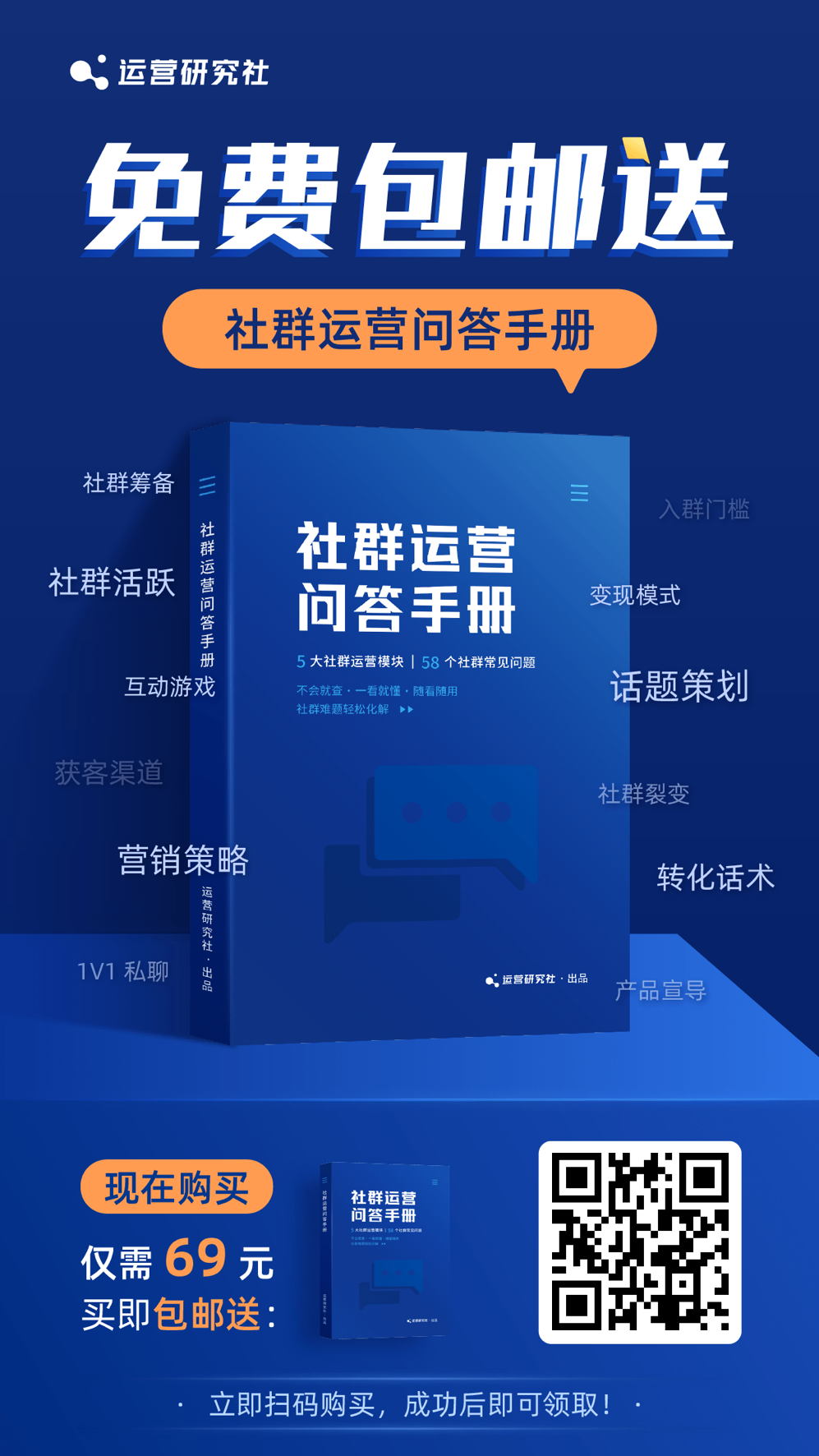 如果你还没入手这本手册,且刚好自己工作跟社群有关,亦或者对社群运营感兴趣。要不滑动目录看看,你或许也能发现不少对自己有用的内容。你的顿悟只是别人的基本功,如果目录里刚好你正在困惑的问题,这本手册你千万不要错过!课程售价 69 元, 现在购买可享受额外福利——免费包邮送 《社群运营问答手册》课程图文纸质版 1 份,心急的小伙伴直接扫码解锁课程(电子版)阅读起来。支付成功后,请根据自动弹出的二维码添加「运营宝宝」企业微信,根据提示填写对应问卷即可领取纸质版手册。此刻,如果你还在犹豫, 可以看看《社群运营问答手册》接下来的详细介绍吧。《社群运营问答手册》是运营研究社出品的第一份【问答式】知识产品。我们将它定位为企业社群和个人社群的运营操作手册,你在运营社群遇到困惑时,打开它就能获得方法的启发,甚至是看到可以直接复用的案例。手册内容覆盖认识社群、社群筹备、社群转化、社群活跃、社群裂变五大模块,帮助你解决运营社群中现在存在的,以及未来可能出现的困惑。一个人可以同时运营多少个社群?