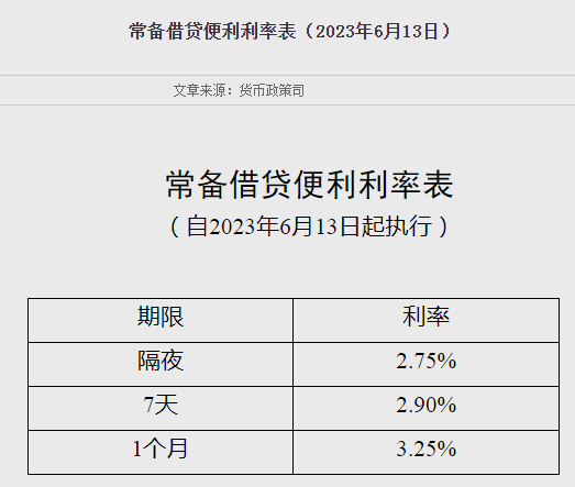 6月13日,央行下调常备借贷便利利率,隔夜期下调10个基点至2.75%,7天期下调10个基点至2.9%,1个月期下调10个基点至3.25%。
