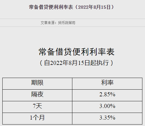 在此前的2022年8月15日,央行公布的隔夜、7天、1个月常备借贷便利利率分别为2.85%、3.00%、3.35%。