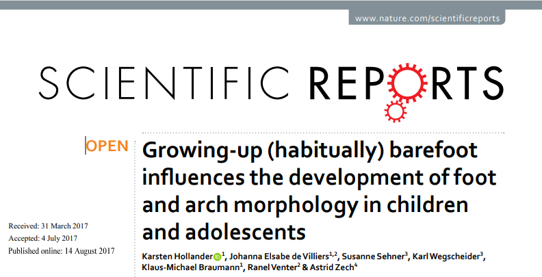 在2017年《自然》杂志的官网上,就发表过这样一个研究,对南非和德国的22所中小学里的孩子进行调查,研究光脚对于足弓发育的影响 —— 在南非的西开普省,光脚上学的孩子很多。而在德国上学则必须穿鞋。
