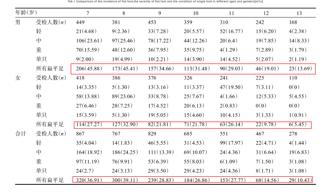 而我国相关研究中,7-12岁的孩子中,扁平足的比例要比上面的高很多。比如今年昆明医科大学附属延安医院发表了论文,对昆明市部分小学学生筛查结果进行分析,发现4444名小学生中,有29.1%的人有扁平足。其中7岁时候高达36.9%,到12岁的时候降低为10.43%。