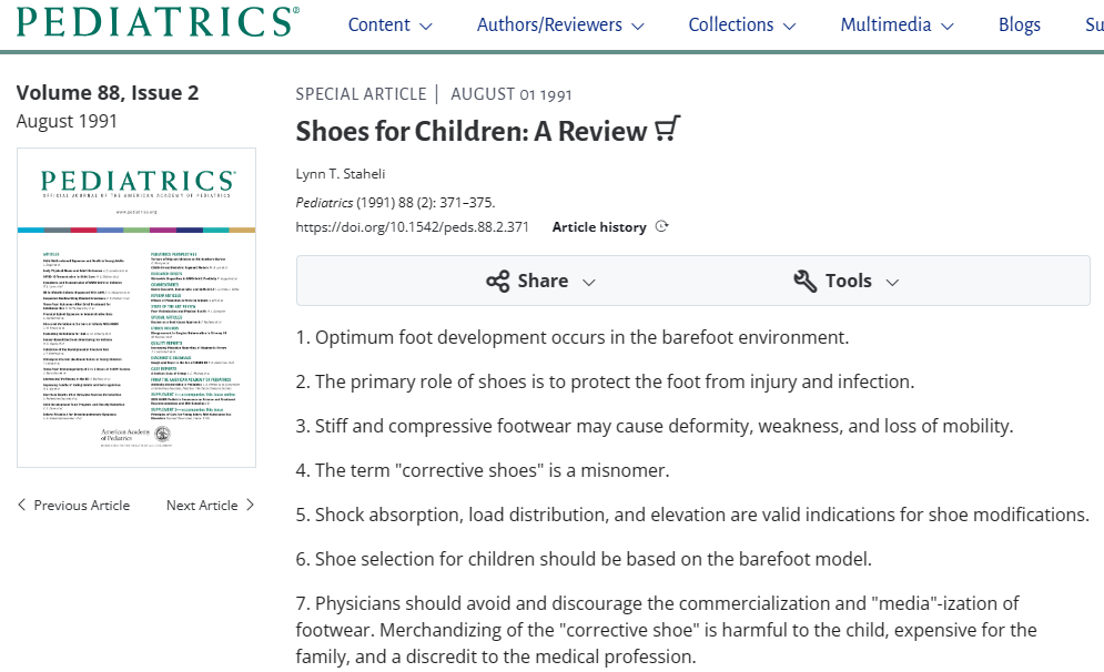 其实几十年前,儿科学界也曾有观点认为儿童的足底和脚腕需要更多的支撑,因此国外有段时间也流行过高帮硬底的宝宝鞋。比如在媒体和厂家推动下,美国也流行过儿童功能鞋和矫正鞋的风潮,针对于此,1991年Pediatrics上发表过一篇Dr. Lynn T. Staheli 关于儿童鞋子综述文章,作者在汇总了各种相关的研究之后,得到了一系列的结论: