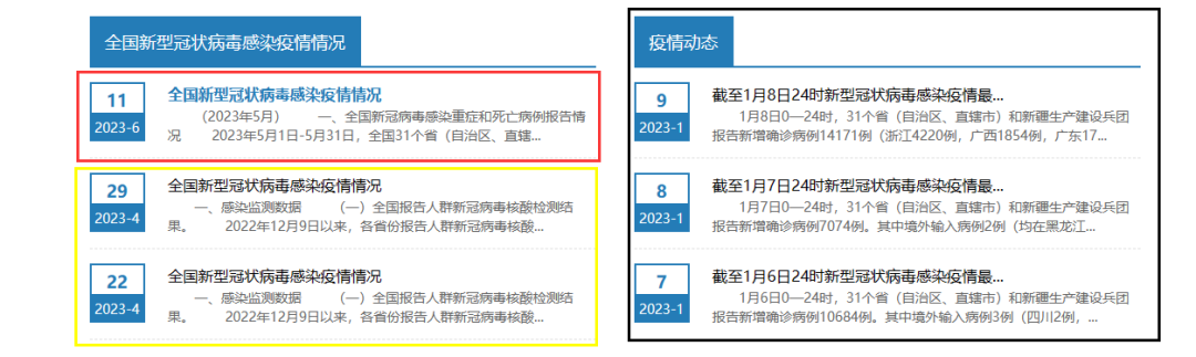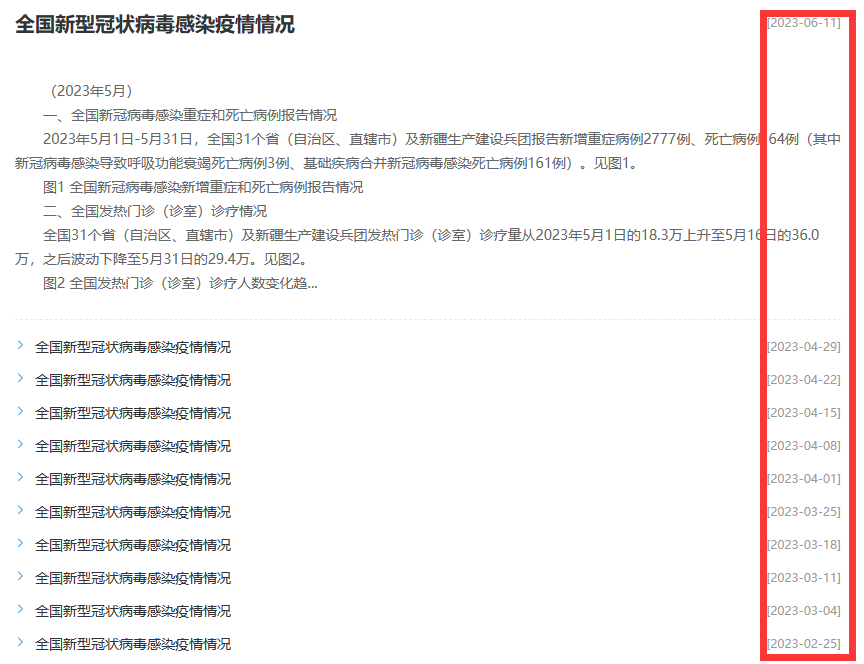 在中疾控的官网上,今年1月9日之前,是每天更新的新冠疫情日报(下图黑色框),而之后的3个多月,是新冠周报(黄色框),而从4月之后,就变成了新冠月报(红色框)。那未来是怎样?会变成新冠年报吗?