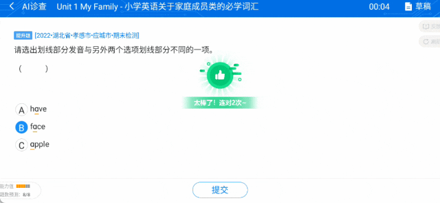 当孩子写完作业后,可以用拍题的功能检查作业,查漏补缺。如果有做错的地方,也会使用AI精准学的功能来训练薄弱的知识点,举一反三。