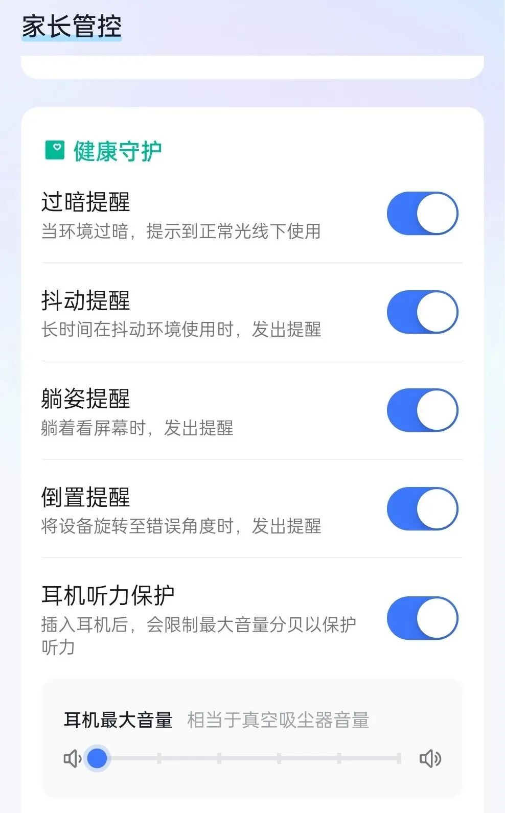 同时提供环境过暗的提醒,以及躺着看手机,手机抖动、倒置这些非正常使用手机情况的提醒。并在孩子使用耳机时,对最大音量进行限制,保护孩子的听力。