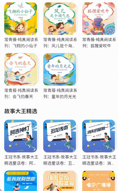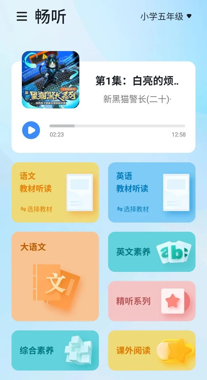 畅听模式可以对课内语文、英语教材进行听读,另外,里面有特别多的课外精选有声读物等听力资源,以及各种世界名著、科幻故事等等,都可以免费听。