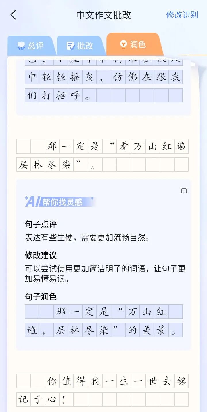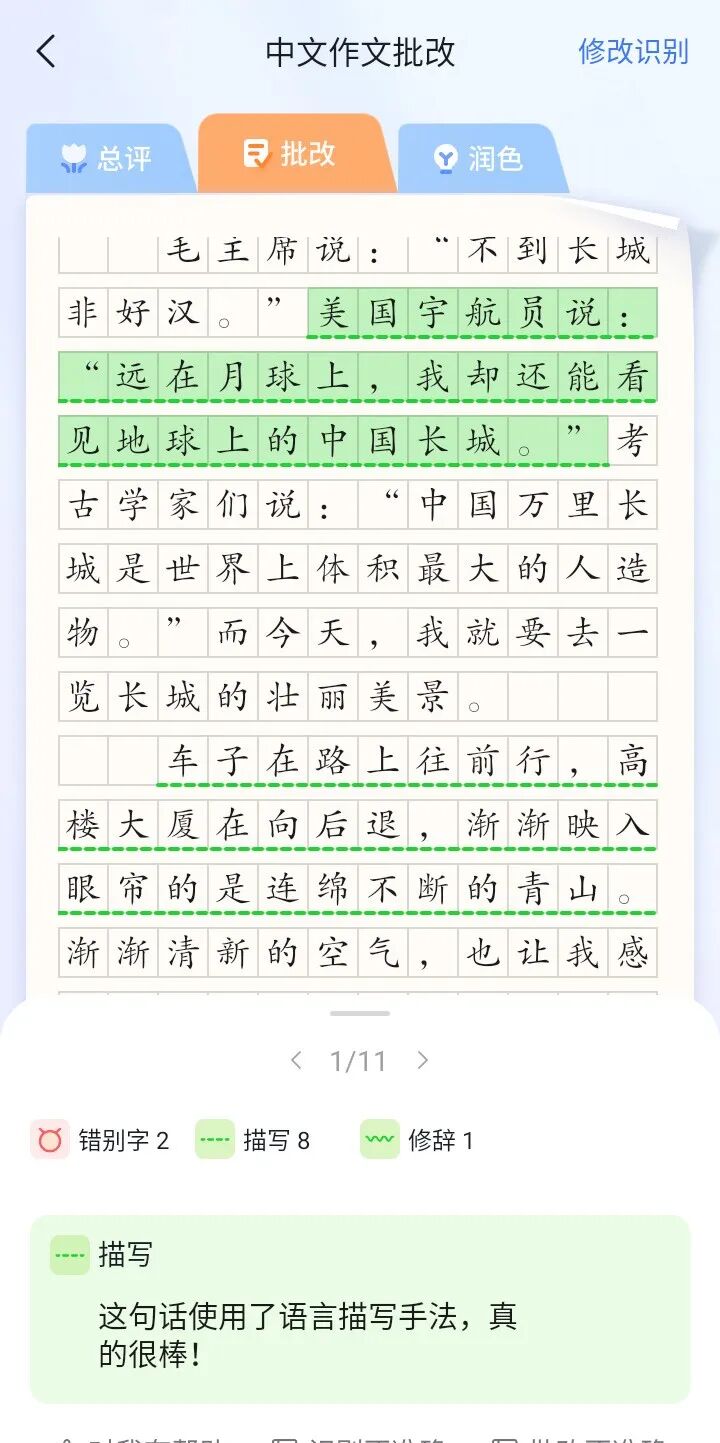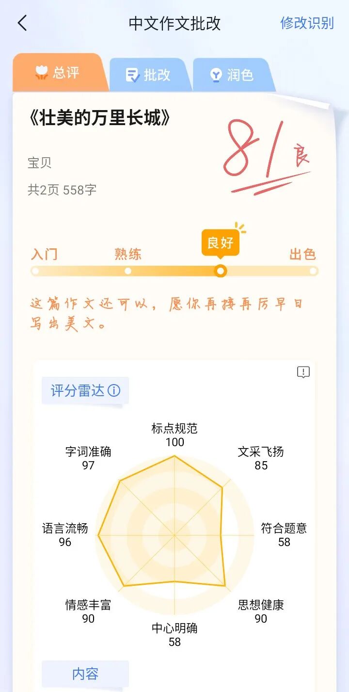 而作为批改功能,就是基于小度灵机大模型,对孩子的作文进行总评、批改、润色,帮忙孩子提高写作能力,补齐短板。