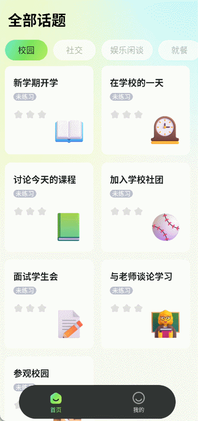 小度青禾学习手机的AI口语对话可以随时随地和AI老师进行对话,内置丰富的对话场景。对话只需要点击自己感兴趣的场景,就可以选择学习词句和开始对话。