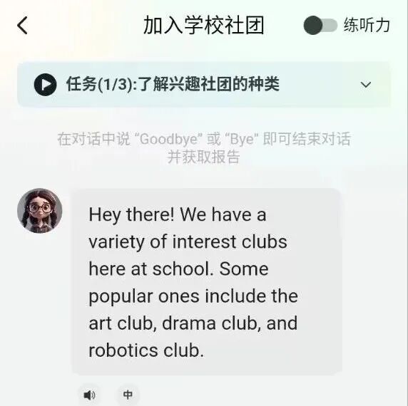 AI对话中,会有一位AI老师1对1对话。对话的过程中,可以随时开启“练听力”模式,进行实战对话。AI老师会对对话的给出一个非常直观的评价,包括发音的准确性和表达的流畅性。