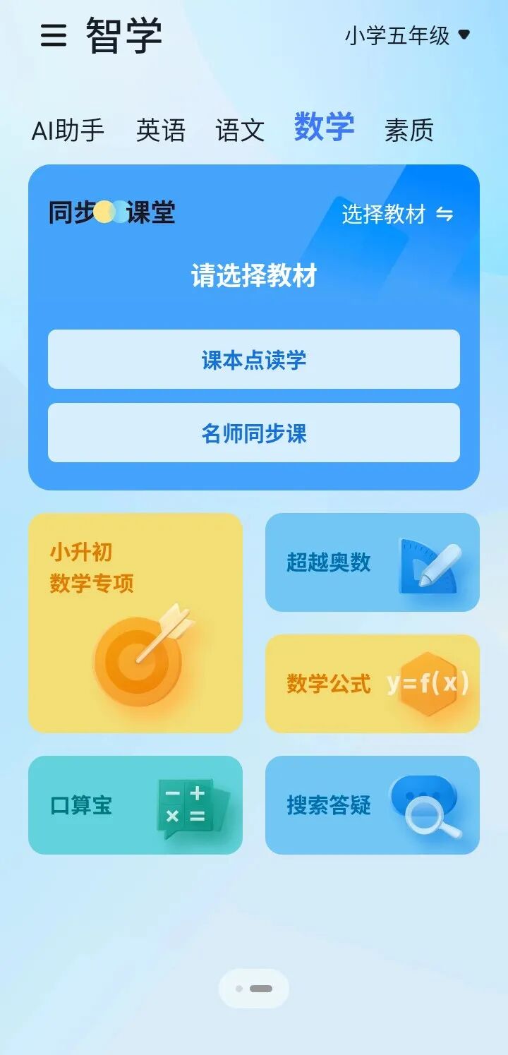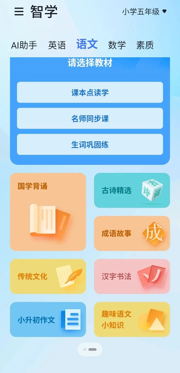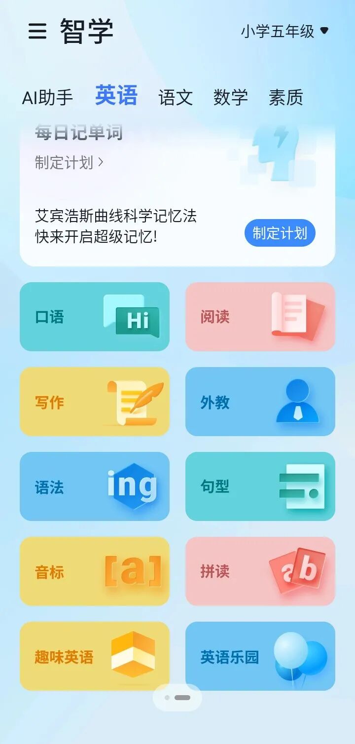 学习资源分为智学和畅听两个模块,智学主要是AI精准学习、批改作文、口语训练、翻译、拍照搜题以及语数英3科小初学科教育课程的内容;而畅听主要是课内教材课文、课外海量优质音频资源的听读。