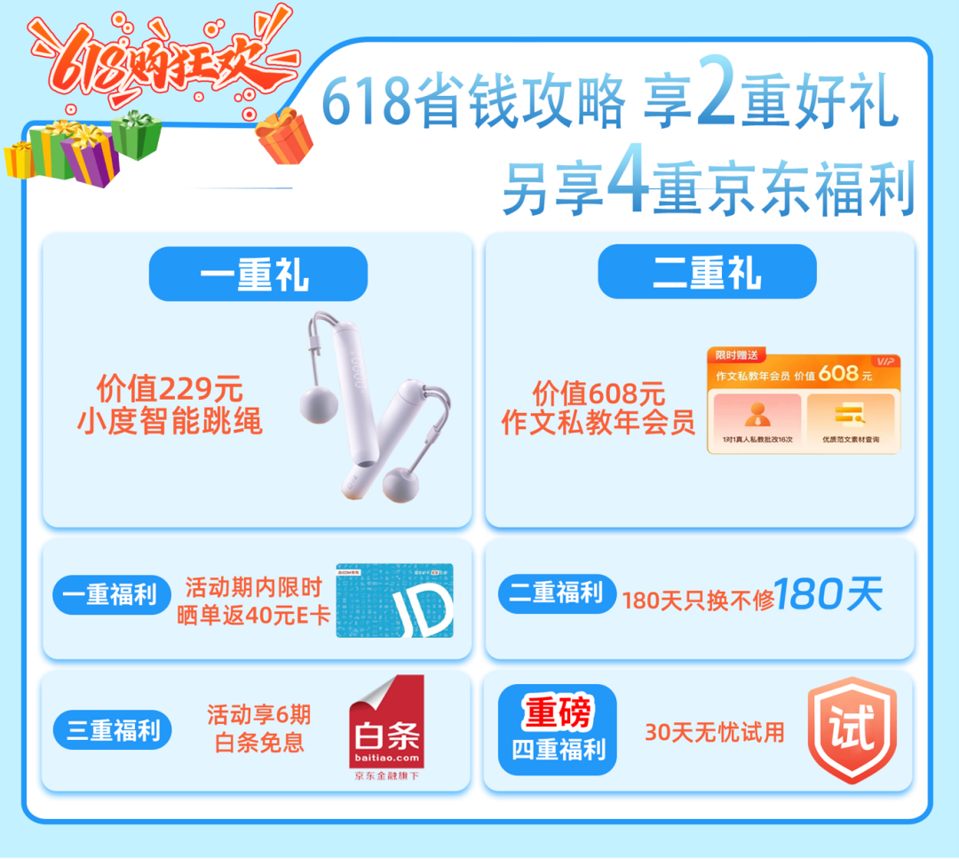 同时,下单就赠送价值229元的小度智能跳绳和608元的作文私教年会员。