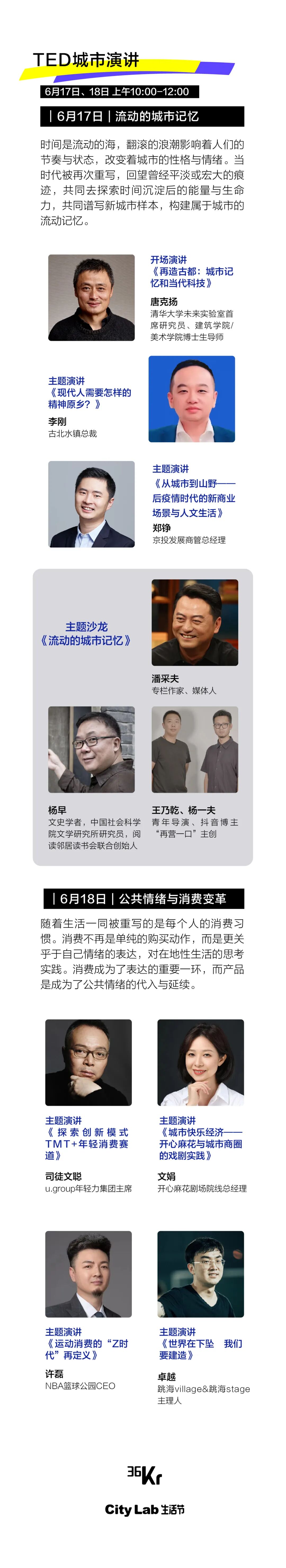 在潮水沉浮起落之间,我们试图重新理解人与城市的关系。6月17日及18日上午10点至12点,在36氪CityLab生活节现场,从事商业、建筑、文旅、文化影视等行业的企业家、学者、导演,将登上TED城市演讲单元的主舞台,现场将会举行两场演讲&沙龙活动,分别以流动的城市记忆、公共情绪与消费变革为主题。