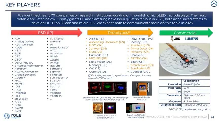 自2015年投入MicroLED研发,JBD在2018年发布首个原型产品,2021年量产第一代单色标品,2022、2023年陆续发布0.85CC、0.4CC的彩色光机,目前二期合肥工厂已宣布投产。