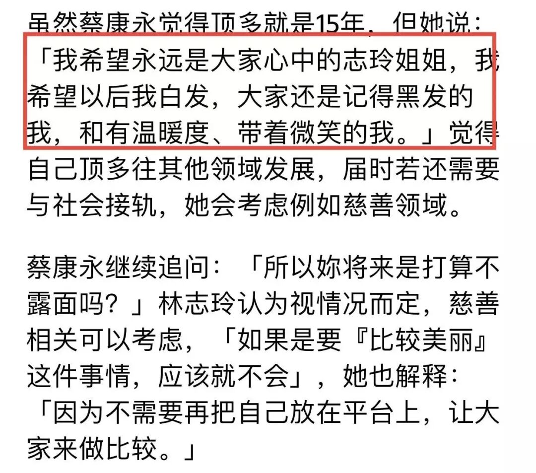 在好友蔡康永的节目中,林志玲直言要退圈,并表示自己还未变老,可是希望大家能够记住她最美的样子,不要让大家见到她衰老的模样。
