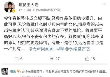 吃饭途中,董洁去隔壁接电话,电话打了一段时间,王大治来找董洁,抱住她,并且亲吻多次。还有网友专门去扒了他俩的微博互动,那叫一个...郎情妾意王大治和董洁一起拍《相爱十年》,他发微博说:我爱海的神秘,怕海的莫测,对你亦如此…王大治老婆是厦门人,大家都以为他在给老婆表白,谁也没想起来,董洁是大连人。没两分钟董洁就发,六一快乐!没给你的吻回来补上……爱你。12年那会,董洁的孩子才3岁,应该还不会玩微博吧?王大治在微博分享自己学游泳,董洁去评论"你是有多笨呀!呀!呀!"王大治就回她:"哈哈,有机会董老师教教我,你是海边长大的水姑娘啊。"不是,锤爷邀大家一起脑补一下,冷清秋这张脸对着你说:"你是有多笨呀!呀!呀!"早些时候,大家看这些都没往歪处想,毕竟双双出轨还敢公开调情,正常人干不出来这事。现在回头想想,他们是不是觉得,我们也是play的一部分...?这些微博现在还能找到,不过董洁的部分已经被她给删了。大多数人都知道董洁是出轨过王大治的,那大家知道,这件事最早是怎么发现的么?前一年结婚纪念日的时候,潘粤明在那甜甜蜜蜜,董洁的回复竟然是:王大治力挺董洁,让大家给董洁一个安静空间,别伤害孩子。