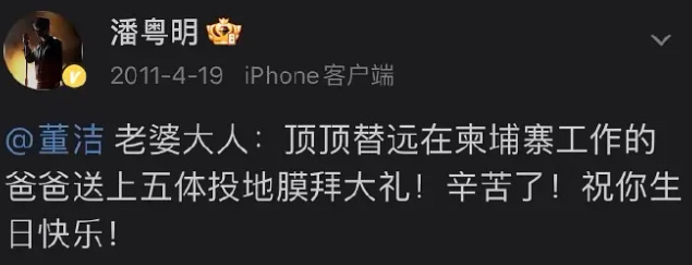 潘粤明和董洁在2005年因拍剧认识,随后没多久两人就被拍到一起去迪士尼游玩。当时记者采访潘粤明,潘粤明一口就承认了恋情,还说女朋友这么好,他很幸福。2008年,两个人就低调结婚了,工作室也官宣了结婚照。当时有媒体拿董洁生二胎出来嚼舌根,董洁都不在意,潘粤明会跑去微博上给她撑腰,帮她怼媒体。