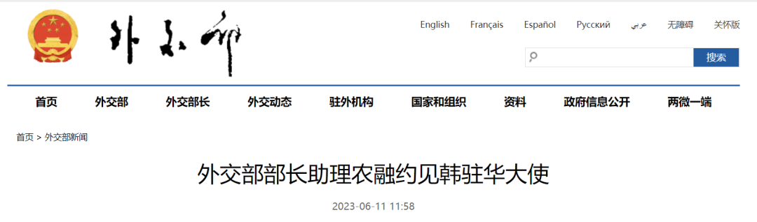 2023年6月10日,外交部部长助理农融约见韩国驻华大使郑在浩,就日前韩方针对中国驻韩国大使同韩在野党党首李在明会见交流所作不当反应提出交涉,表明严重关切和不满。