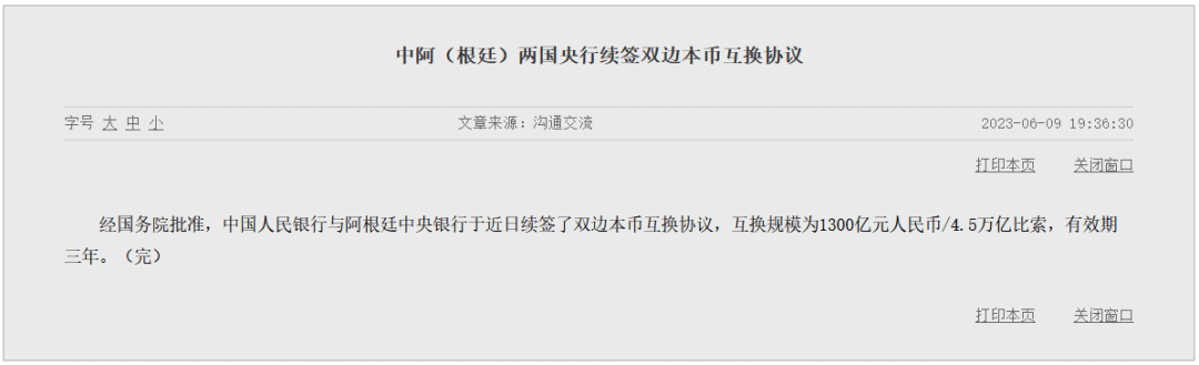 6月9日,中国人民银行发布消息称与阿根廷中央银行近日续签了双边本币互换协议,互换规模为1300亿元人民币/4.5万亿比索,有效期三年。这则消息引起很多网友关于阿根廷“阿根廷换到人民币之后还是拿人民币换美元”的猜测和相关争议。