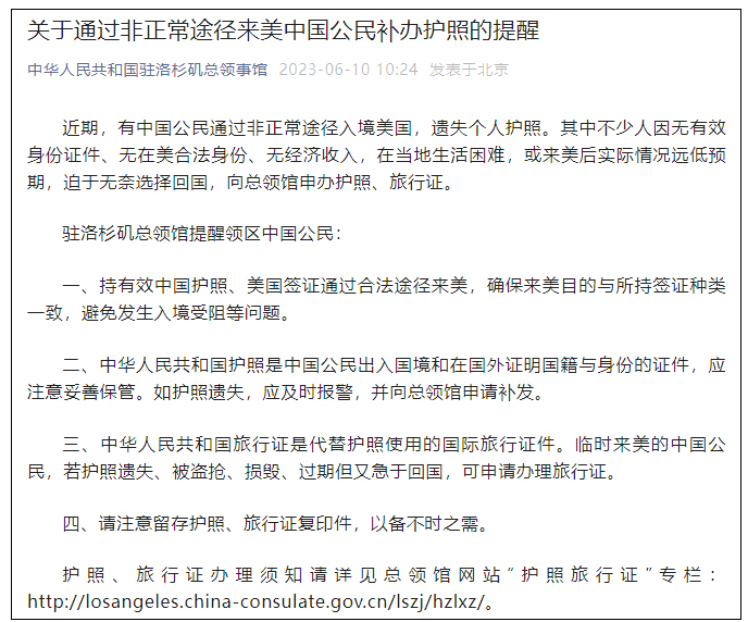 6月10日,微信公众号“中华人民共和国驻洛杉矶总领事馆”发布关于通过非正常途径来美中国公民补办护照的提醒: