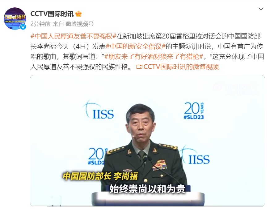 在新加坡出席第20届香格里拉对话会的中国国防部长李尚福今天(4日)发表中国的新安全倡议的主题演讲时说,中国有首广为传唱的歌曲,其歌词写道:“朋友来了有好酒,豺狼来了有猎枪。”这充分体现了中国人民厚道友善不畏强权的民族性格。