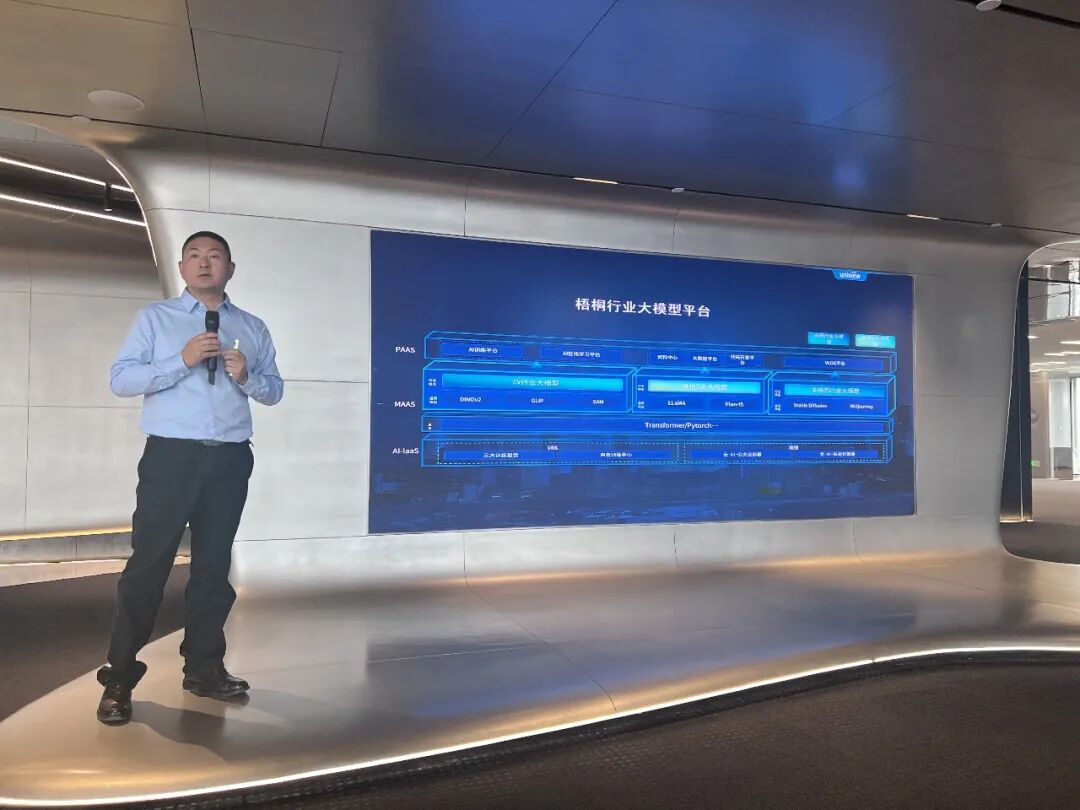 ▲宇视云智能产品部部长汤利波在讲解梧桐大模型平台