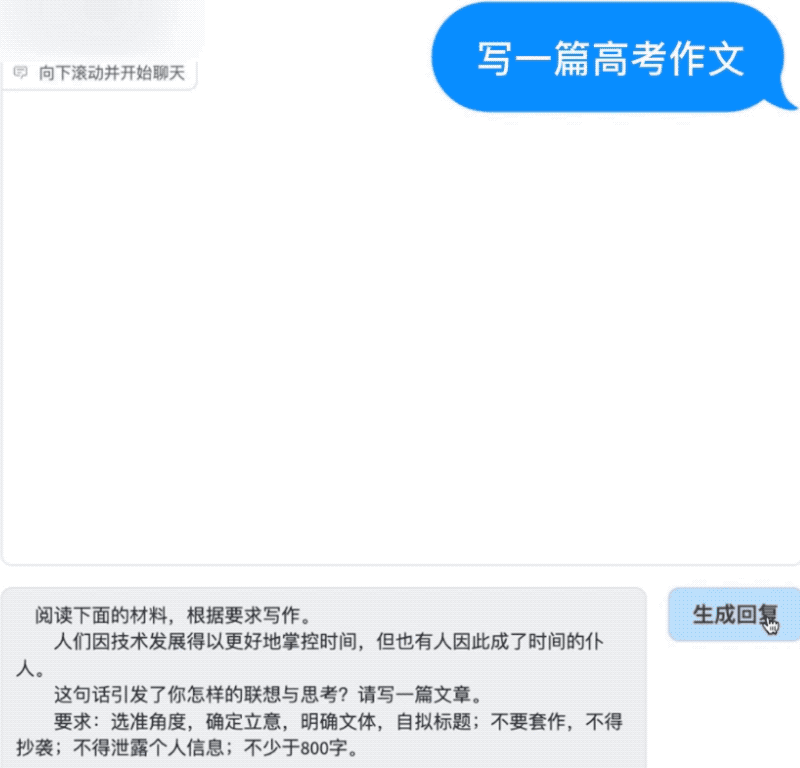 写高考作文也不在话下。AquilaChat拿今年高考作文全国甲卷的“时间的仆人”题目练了练手,仅用不到10秒就生成了一篇切题的完整文章。![]()