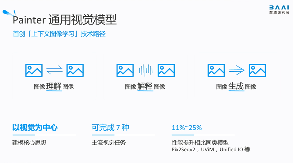 智源将NLP中的上下文学习概念引入视觉模型,打造了将“以视觉为中心”作为建模核心思想的通用视觉模型Painter。Painter把图像作为输入和输出,从而获得了上下文视觉信息,完成不同的视觉任务。该模型目前可完成7种主流视觉任务,已在深度估计、语义分割等核心视觉任务中,相比同类模型有11%~25%的性能提升。论文地址: