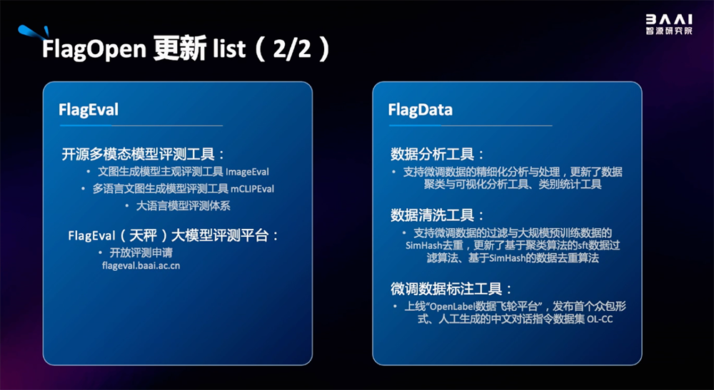 FlagPerf建立了评测Case的各项标准、支持容器内评测模式;新增国产芯片的评测系列,包括昆仑芯、天数智芯等;评测系列从语言大模型扩展到多种主流视觉模型。FlagEval包含多种开源多模态模型评测工具和FlagEval(天秤)大模型评测平台。FlagData包含数据分析工具、数据清洗工具、微调数据标注工具等。![]()