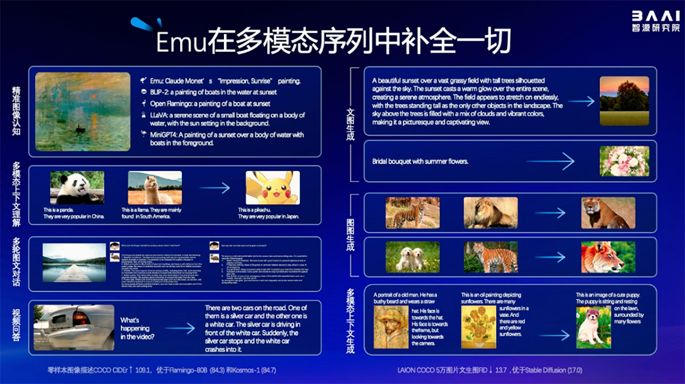 除了发布开源语言大模型及评测体系外,智源研究院还一连发布了“悟道·视界”视觉大模型系列的6项先进技术成果。据黄铁军分享,从技术路线而言,通用视觉模型与语言模型的方法论类似,但视觉涌现与语言涌现的形式有所差别。传统视觉模型属于判别式模型,通用视觉模型则更看重对未知事物的通用辨别能力和生成预测能力。“悟道·视界”由悟道3.0的视觉大模型团队打造,是一套具备通用场景感知和复杂任务处理能力的智能视觉和多模态大模型系列。6项国际领先技术中,前5个是基础模型,最后1个是应用技术。Emu是一个多模态-to-模态的大模型,输入输出均可为多模态,可以接受和处理不同模态的数据,并输出各类的多模态数据。基于多模态上下文学习技术路径,Emu能从图文、交错图文、交错视频文本等海量多模态序列中学习。训练完成后,Emu能在多模态序列的上下文中补全一切,也就是可通过多模态序列做prompting(提示),对图像、文本和视频等多种模态的数据进行感知、推理和生成。![]()