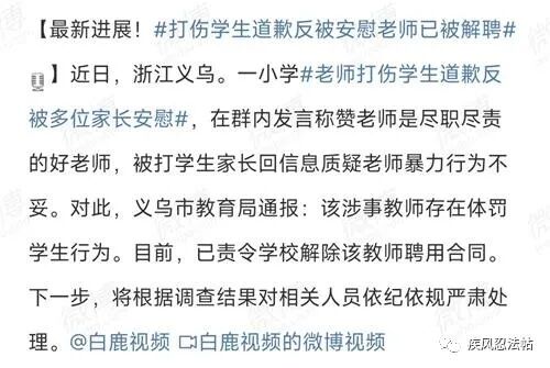 浙江义乌某小学老师打伤一名女生后,被迫在家长群里向该女生和家长道歉,有多名家长不惜做“舔狗”,毫不顾及该家长的心情,向老师表达感恩之情。
