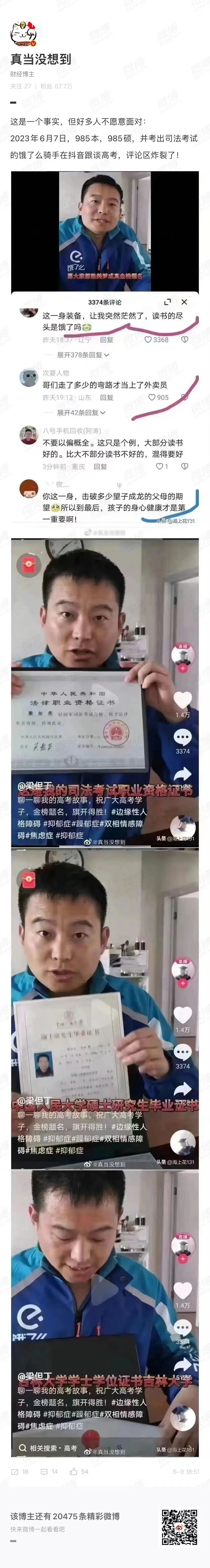 最近,有一个抖音视频可能会对高考生家长构成刺激。一个吉林大学本科、中国人民大学硕士、且通过了司法考试的外卖骑手,在抖音里谈高考,评论区炸裂了。