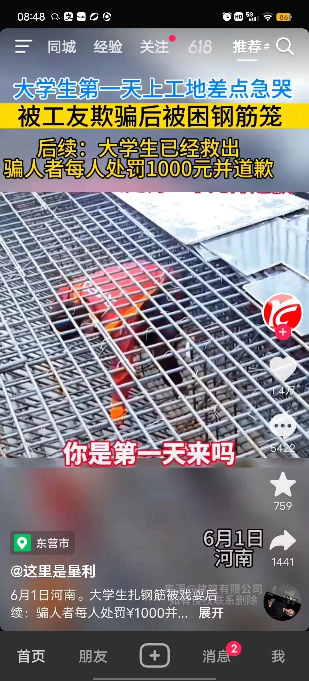 6月,河南某地,一个大学生勤工俭学到工地扎钢筋,上班第一天,工友就骗他到钢筋下面扎,结果导致受困出不来。
