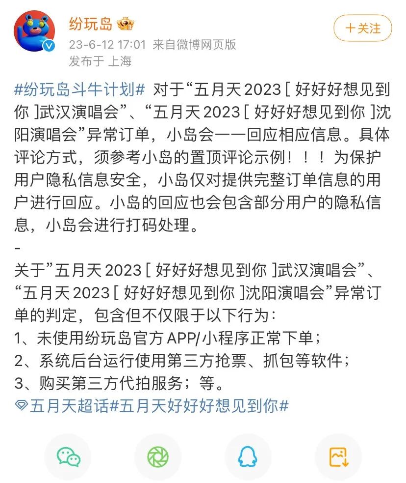 6月12日下午,纷玩岛在官方微博发文回应订单异常一事。纷玩岛称,工作人员排查出五月天2023年演唱会武汉场、沈阳场共计754张异常订单,并有证据证明此类订单因违规手段产生,而非正常途径购买。平台方面已对异常订单进行退款退票处理,门票将再次售卖,异常订单的排查不会影响任何通过正常途径购票的歌迷朋友。