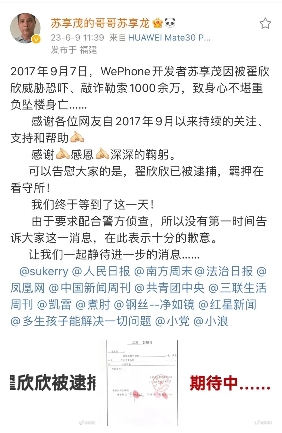 6月9日,苏享茂的哥哥苏享龙在微博上透露,翟欣欣已经被逮捕,羁押在看守所。