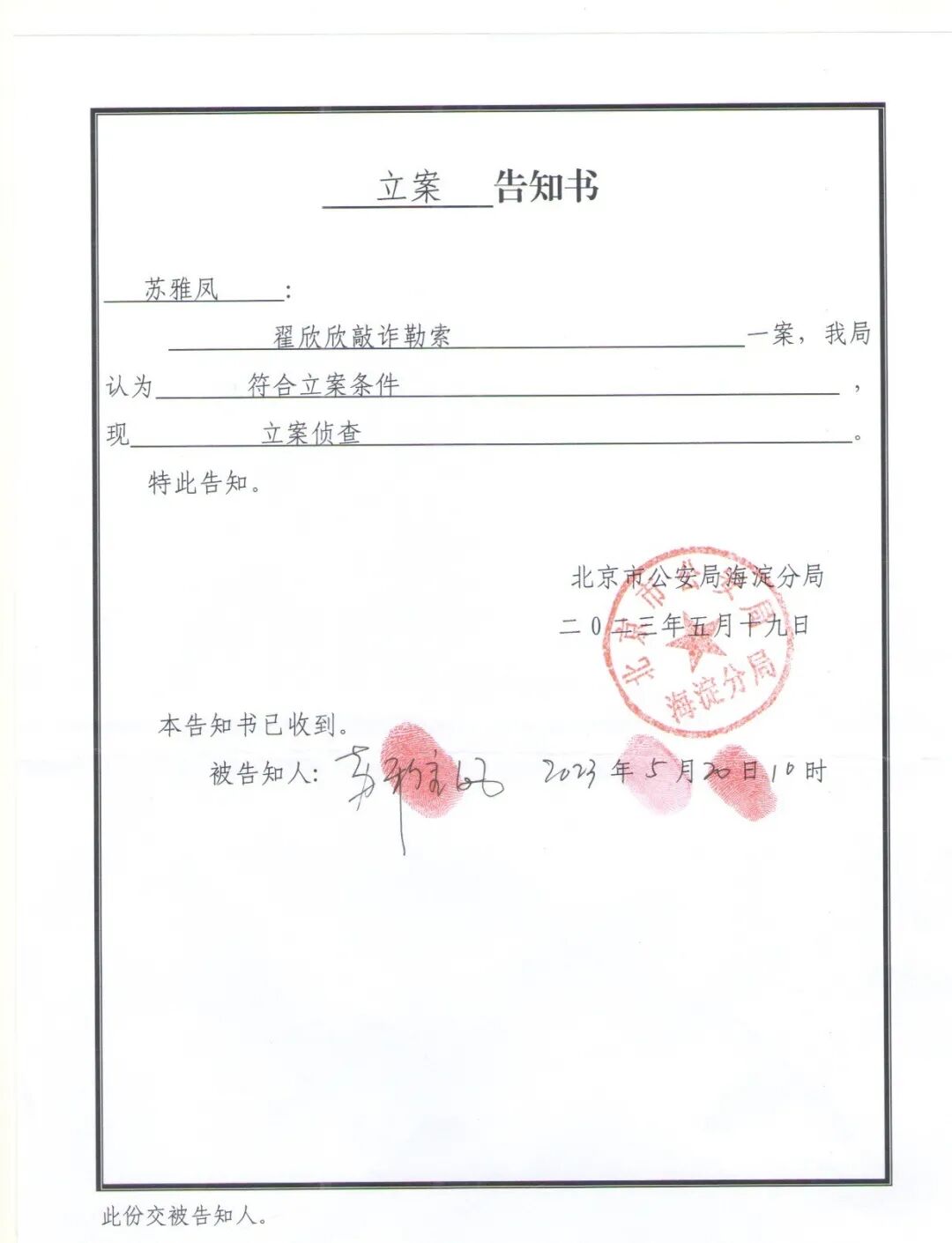 他还贴出了北京海淀分局的“翟欣欣敲诈勒索”立案通知书。