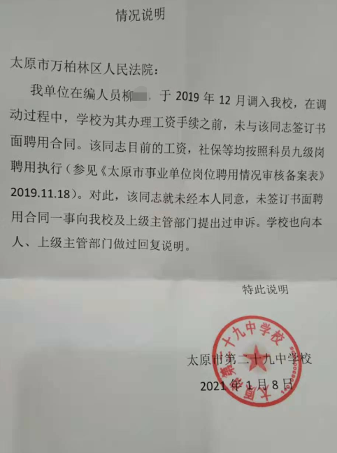 在一份盖有太原市第二十九中学校公章的情况说明上,红星新闻记者看到,该校在2021年1月8日曾向当地法院说明,柳某在调入该校的调动过程中,学校在为其办理工资手续之前,的确未与其签订书面聘用合同,目前是以科员九级岗标准在为其发放工资。只是对于未签订书面合同一事,该校表示,曾就此事向上级主管部门提出过申诉,也向柳某本人做过回复说明。