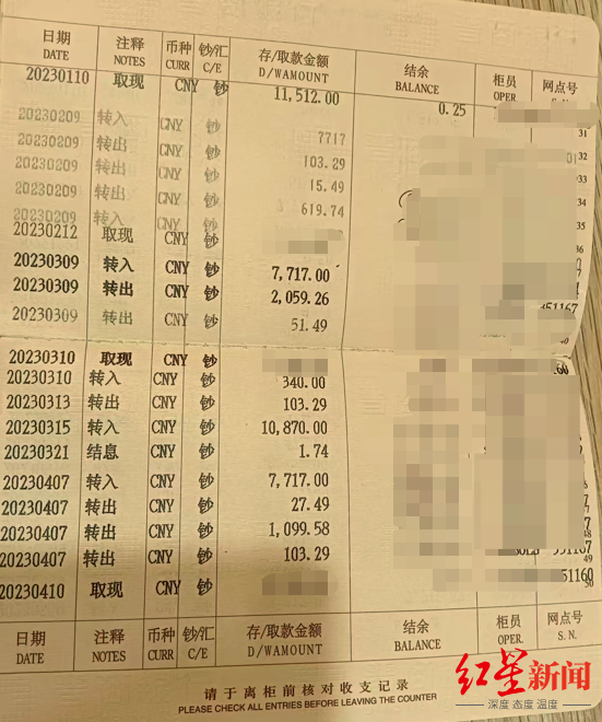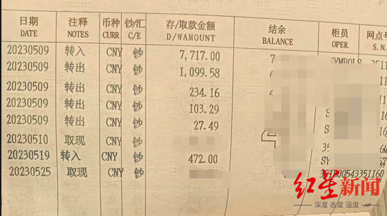 据柳某提供的个人活期存折显示,2022年12月9日,有一笔7764元的钱款转入;2023年1月10日,又有一笔7717元的钱款转入……红星新闻记者也注意到,在之后的2月9日、3月9日、4月7日,以及5月9日都有7000元左右钱款转入。
